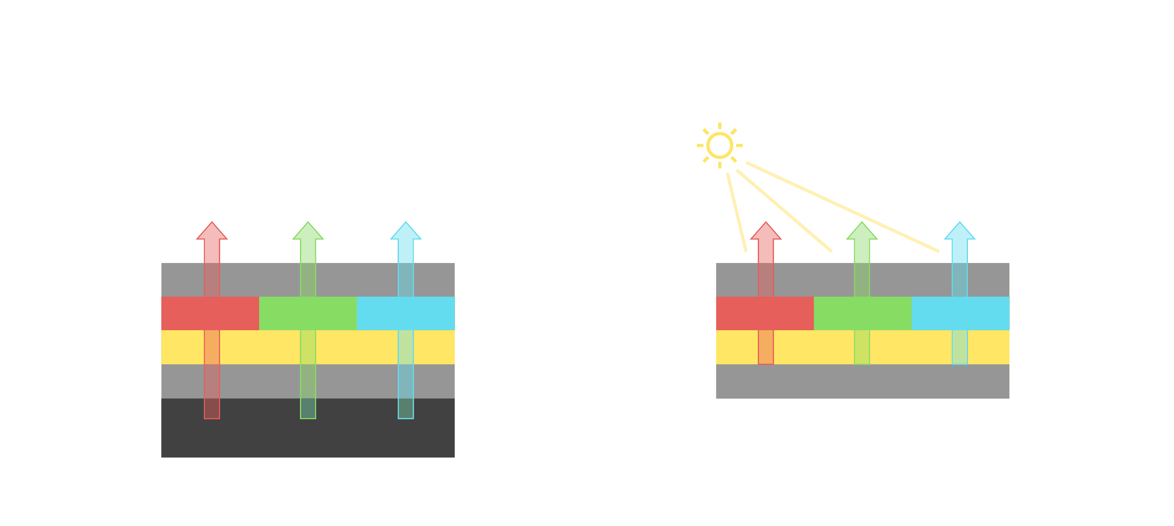与传统需搭配背光单元的液晶显示相比,,反射式液晶技术不仅更省电、、、更轻薄,,,,且即便在艳阳下仍能清晰显示。。此外,,,少了背光单元,,也大幅降低了 LED 蓝光伤害眼睛的疑虑。。。