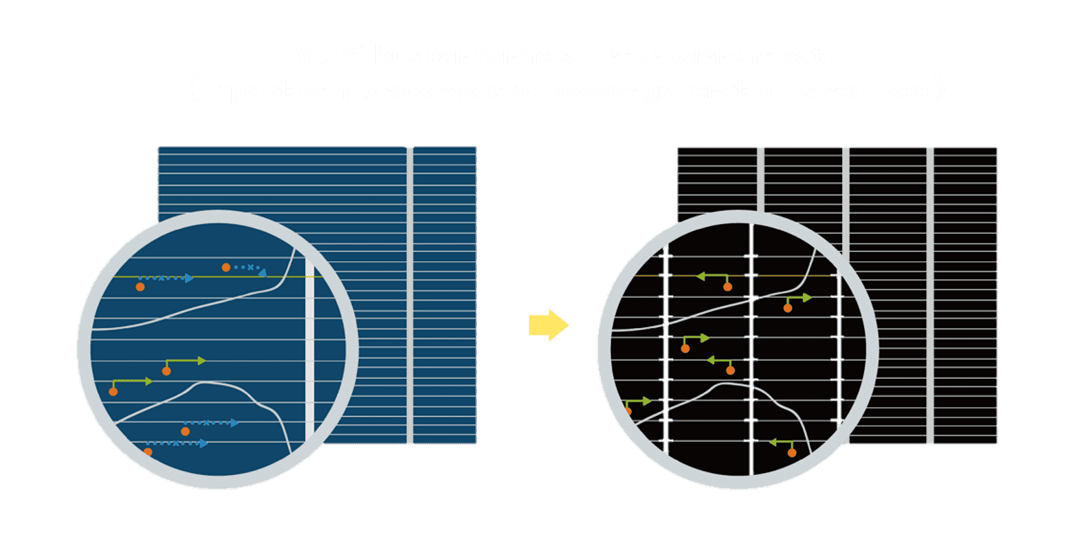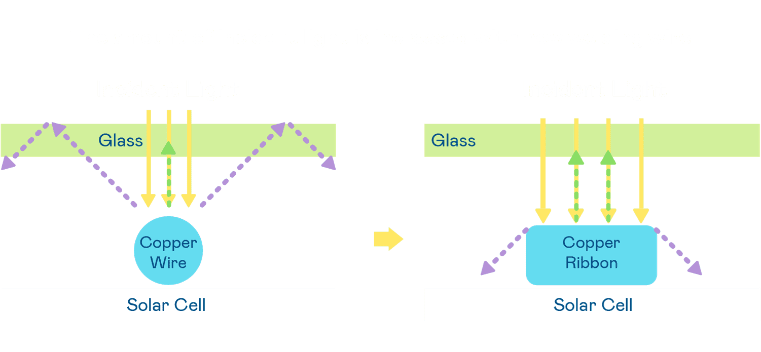 • 电池使用多条铜导线 (Copper wire) 于电池片上形成较短的电流路径,,提高电流收集效率,,,,采用圆形设计的铜导线较传统扁平式的铜焊带 (Ribbon),,可增加入射至电池的光线量。。。。