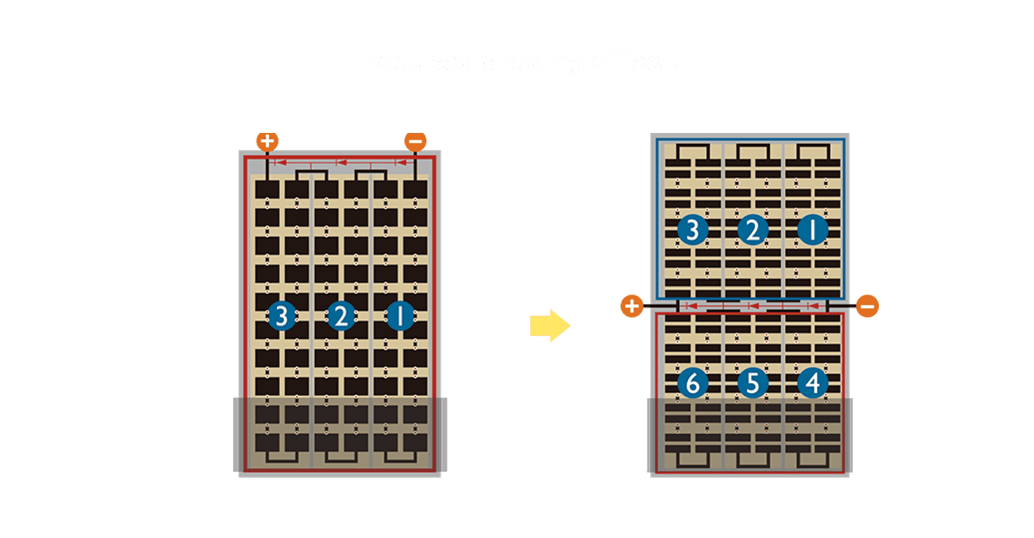 • 结合半切电池,,降低遮阴影响、、提升模组抗隐裂能力、、并减少电阻损耗,,,进一步提升模组发电效能。。。