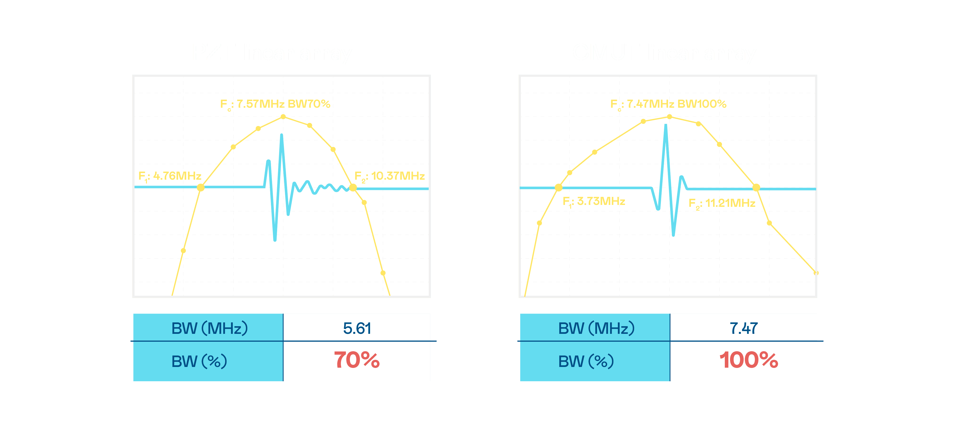 超音波影像的解析度高低,,,首先取决于探头能发出的讯号频宽。。。欧陆注册 CMUT 可提供高清晰的超音波讯号,,,提供高频宽、、、、高灵敏度、、、影像纹理细节更高的超音波影像,,,,协助医护人员缩短影像判读时间及利用精准的医疗影像进行诊断。。。。